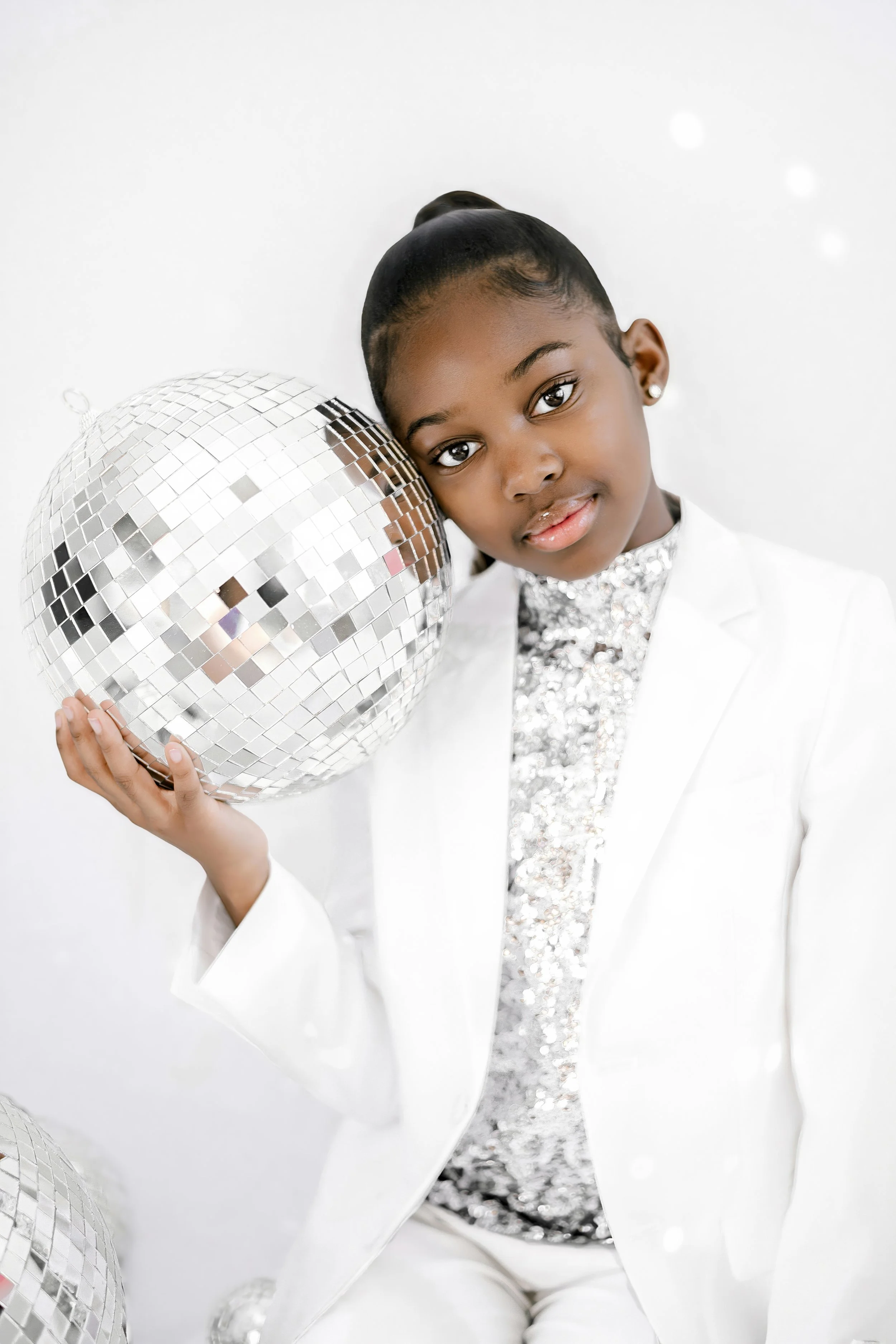 To complete the look, we brought in a 14 inch silver disco ball and smaller complements from Michaels. Having her toss and catch it with the reflections gave us some amazing shots! Small details make the biggest impact! Sometimes all it takes is one prop to shift the energy of an entire session. 🪩